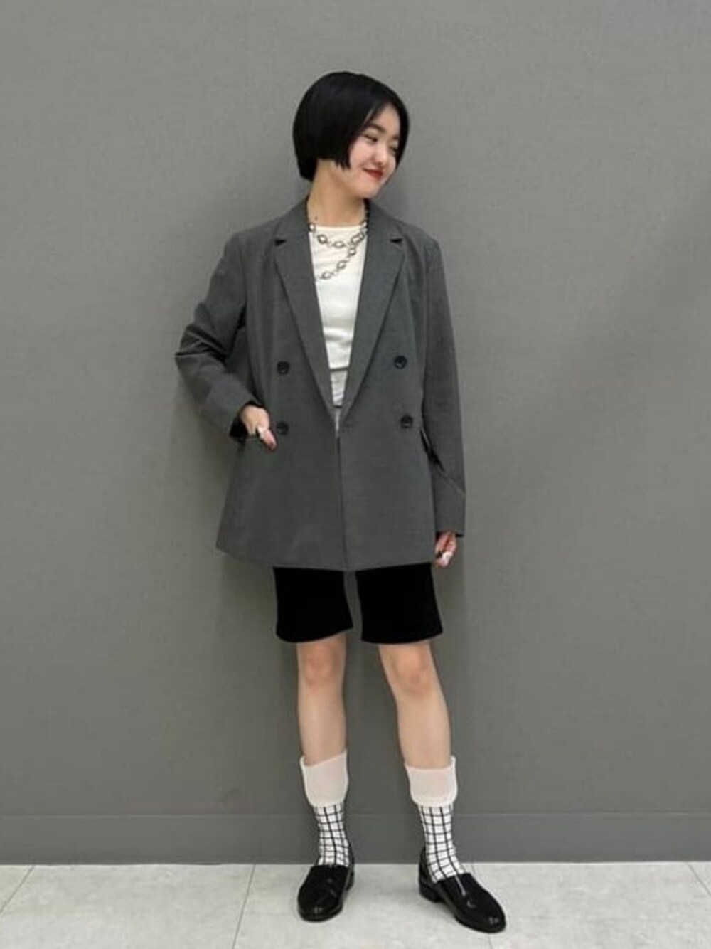 Ray BEAMS(BEAMS WOMEN)のテーラードジャケット「シャークスキン 4ボタン ダブル ジャケット」を使ったコーディネート