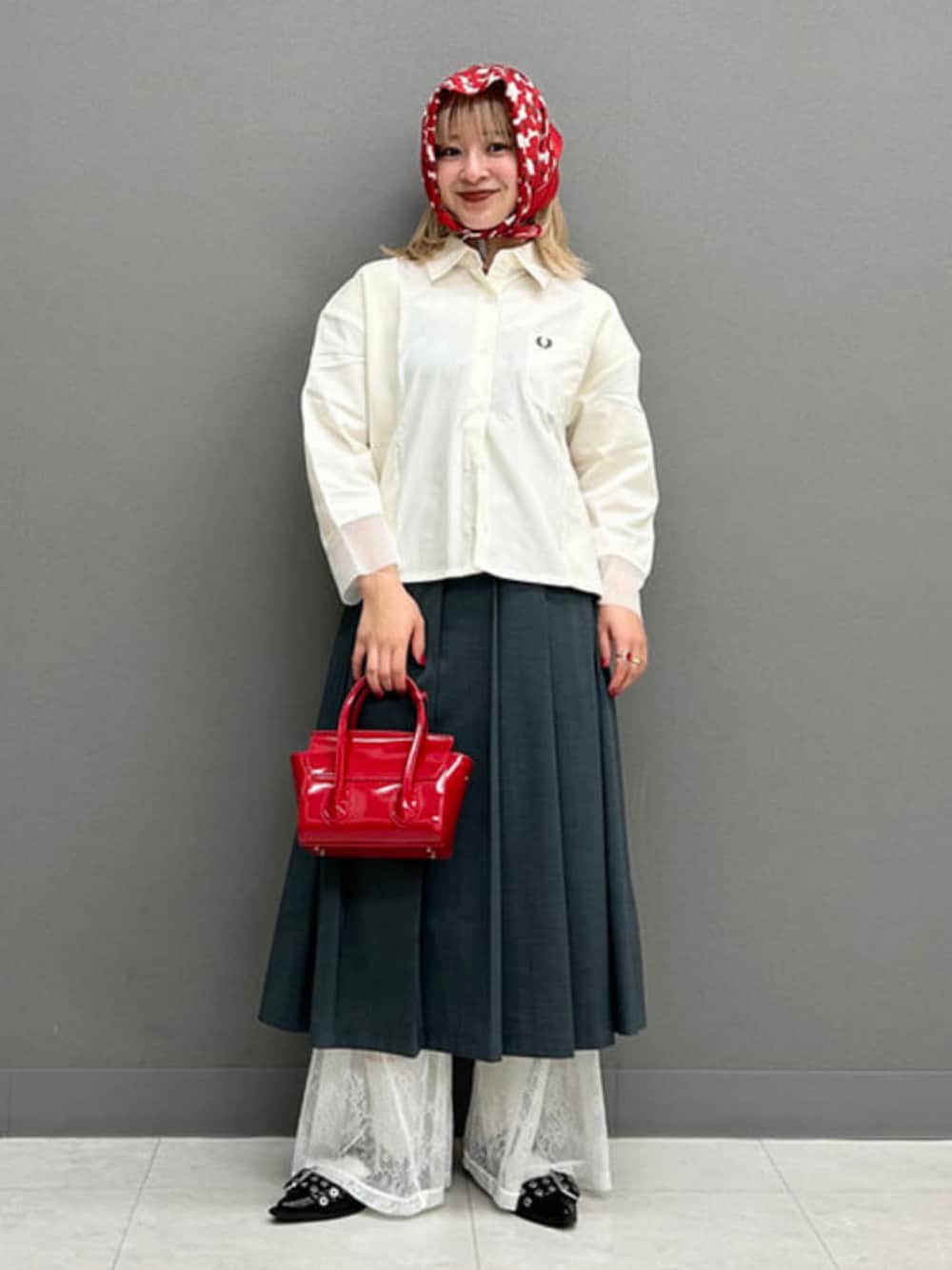 【今から着やすいアイテムです♡】〈158cm/FREE〉身幅、袖幅共にゆったりしたサイズ感の〈FRED PERRY〉別注のシャツ。着丈は長すぎないのでスタイルアップがかないます♡素材が切り替わっていたり、手首の裾部分のシアーがかわいいです♡プリーツスカートは〈サイズ1〉を着用していますが、少し大きめでした!ハートのバンダナ頭に巻けるサイズ感でしたのでプラスして、小物は赤で統一しました〜 Ray BEAMS / ナカノ アイ