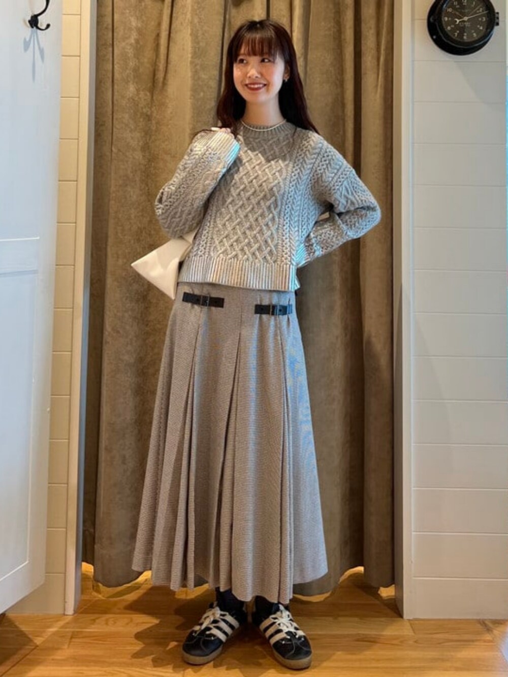モノトーンで統一した秋らしいスタイリングです。ニットの裾部分には箔プリントがされていてトレンド感満載です。スカートは今年はこの丈感がグッドです◎下の商品ページからご予約いただけます! ビームス 二子玉川 / mayu