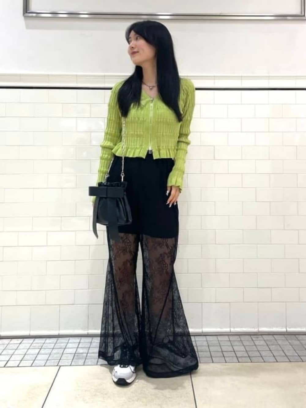 【グリーン映え〜】トップスもパンツもフリーサイズです◎色味がかわいいジップカーディガンは、上からも下からも調節可能なダブルジップ仕様!もう少しジップを開けて、中に着ているインナーをチラ見せするのもかわいいです♡レースパンツはウエストがゴムになってるので、腰回りが気になるわたしでも楽に着用できました◎フレアパンツなので、女性らしさも出しつつスタイルがよく見えます〜!嬉しい〜!丈は少し長めで、160cmの私が履いて写真の通りです! ビームス 武蔵小杉 / rina