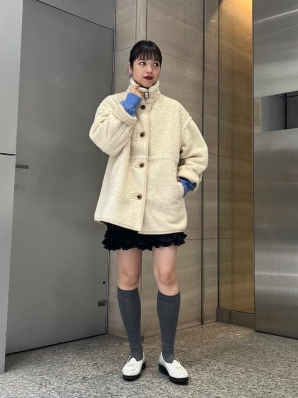【ひつじ♡】みたいなもこもこアウター♡もこもこしすぎず見た目より重みもないので、さっと羽織れます♪裏地がとても触り心地よく少しお袖を折るのがポイント◎ブルーのニットは厚手でないので今から楽しめますよっ( ◠‿◠ ) ビームス 銀座 / Marin