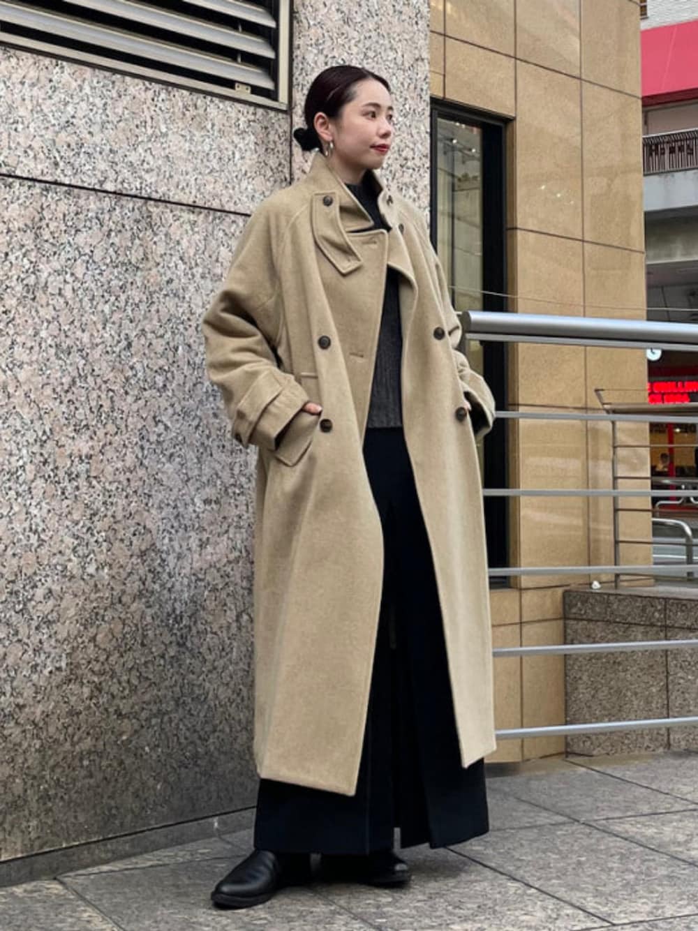 【軽くてあたたかい】寒い冬を乗り切るためにおすすめなスタンドカラーコート。たっぷりの丈感でサマになります。襟を立てればマフラーいらずで温かいですよ。見た目は重厚感がありますが、着てみるとびっくり。想像以上に軽量で快適な着心地です。中に着たニットは〈AK+1〉。温もりのあるふわふわなニット素材でこれからの時期にぴったり。長過ぎない着丈でもたつかず、スッキリとした印象をもたらしてくれます。 ビームス 町田 / ishihara