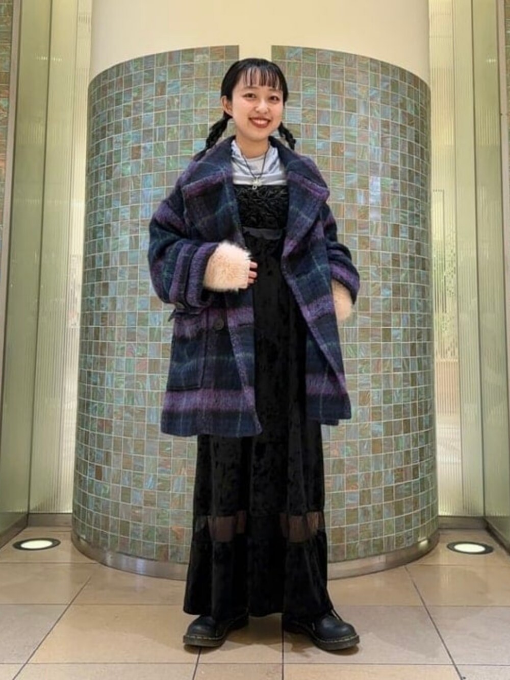 チェックのハーフコートは袖幅も身幅もゆーったりでポンチョライクに着られるかわいいシルエット!!152cmサイズ0着用でこのゆとり感です!中はスッキリ大人っぽくベロアのキャミワンピース!裾のさりげない透け感もおしゃれですね♪ ビームス 天王寺 / カラツ ミナ