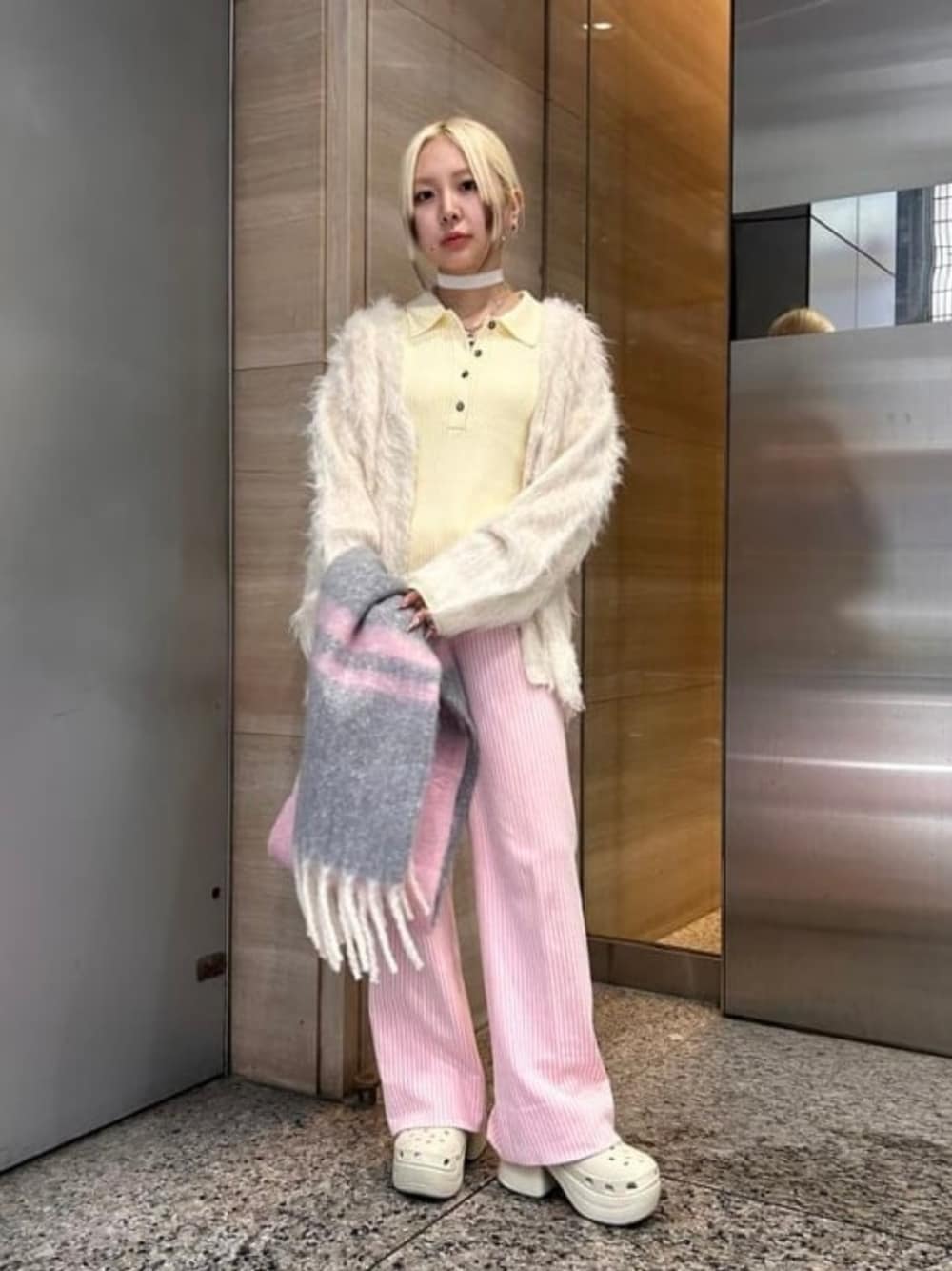 【Pastel♡】本格的に寒くなってきたのでふわふわなシャギーニットでパステルカラーのスタイリング♡カーディガンは着丈が長めなので、気になる腰回りも隠れます。インナーに合わせたニットポロは細身なシルエットが綺麗!ボタンを開けると首周りがよりスッキリします ビームス 銀座 / haru