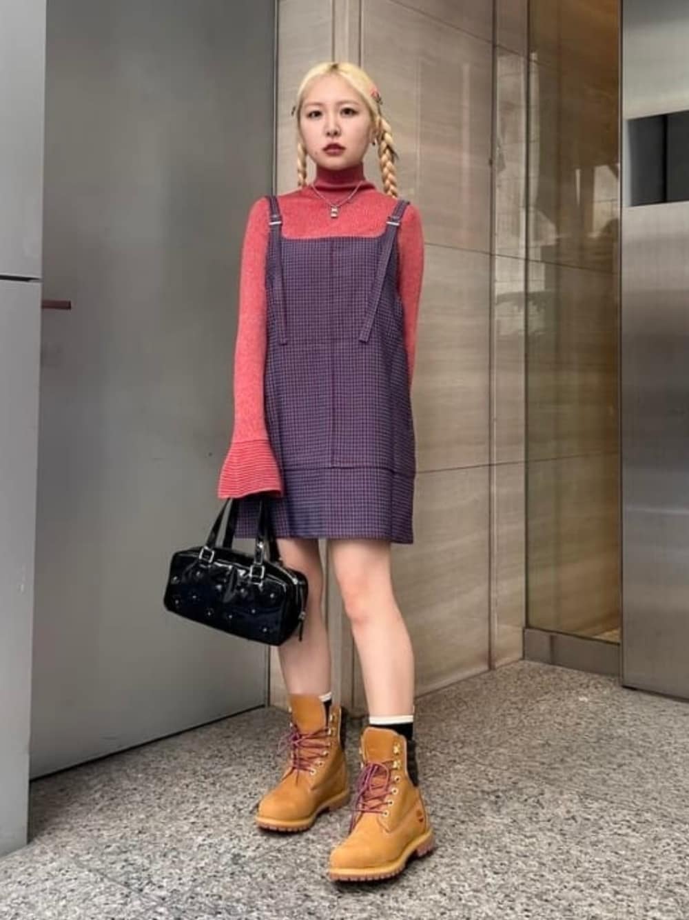 新作のミニワンピ♡台形っぽいシルエットで足を細く見せてくれます!チェックの色味を拾ってインナーも赤合わせ。足元は〈Timberland〉で重たくするのが今の気分です♫ Ray BEAMS / haru