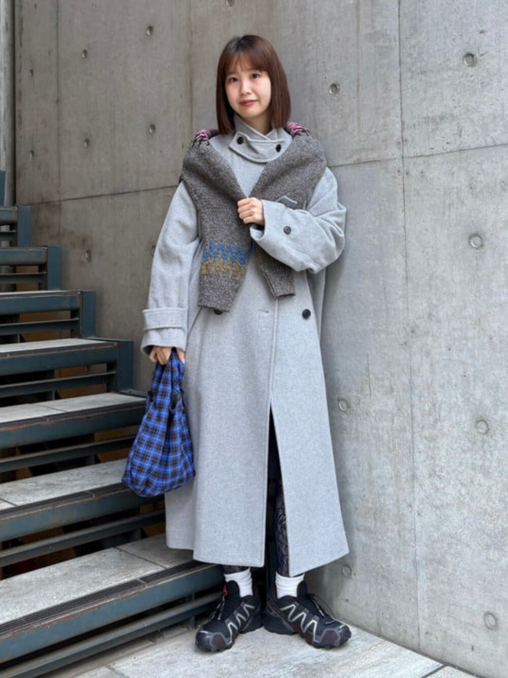 【大人コート】身長163cmサイズ0を着用しています。このグレーの色味、すごく大人ぽいですよね。ウールが多く入ってますので柔らかく軽い着心地です。ロングコートお探しの方、おすすめです! ビームス 二子玉川 / mayu