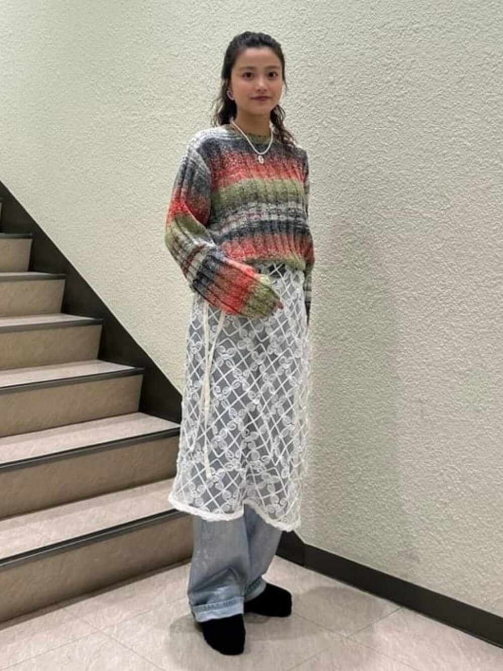 【ボーダーニットが可愛い♡】淡い色が優しい印象にしてくれます♪ボトムスは、箔デニムパンツにチュールの巻きスカートを合わせました![158cm:箔デニムパンツ(1),その他フリーサイズ] ビームス 横浜東口 / リサ