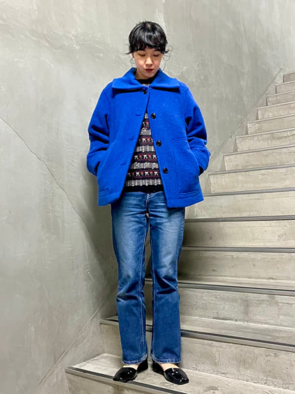 華やかなブルーのコートを主役にカジュアルスタイルにしてみました!中には可愛い柄ニットを忍ばせて遊び心もプラス!〜 ビームス 立川 / kigo