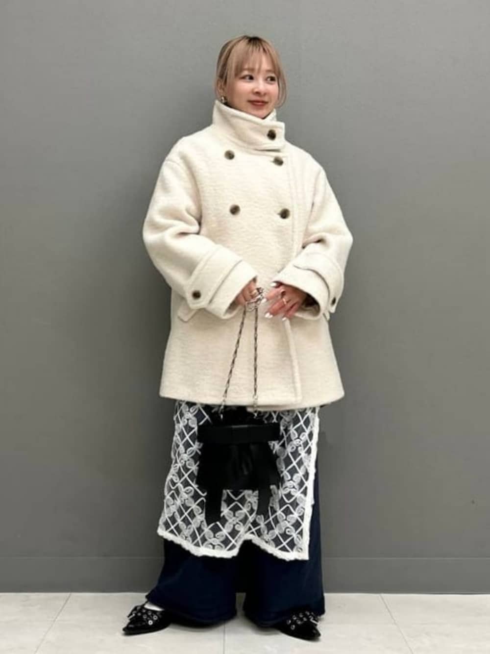 白のラインに合わせてチュールの巻きスカートを合わせました〜ループシャギーコートは〈サイズ0〉でもかなりゆったりめ。首元をスッキリさせるためにアップスタイルがオススメです♡ ビームス ストリート 横浜 / ナカノ アイ