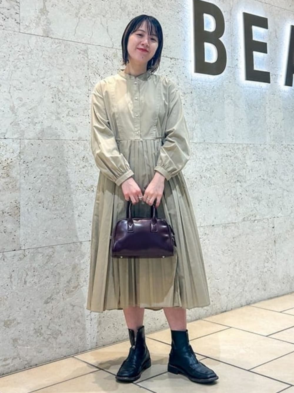 【Ray BEAMS】定番のプリーツワンピース!身長160cmでふくらはぎくらいになる丈です。ベージュの色味も落ち着いているので、可愛すぎず着やすいです☺︎ぜひ参考にしてください! ビームス 名古屋 / 尾関 恵里子