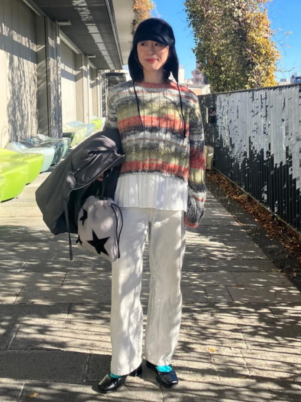 【鮮やかニットで脱地味!】 【身長157cm.骨格ナチュラル.ブルベ冬】 冬ってどうしても落ち着いたカラーになりがち、、そんな時はニットで色を取り入れるのがおすすめです♡ 短めの丈感なので、中にブラウスを重ねてみました!ハイウエストのボトムスが無くても安心です♪ もこもこ星のバッグは去年に引き続き大人気ですよ(^O^) Ray BEAMS / うに