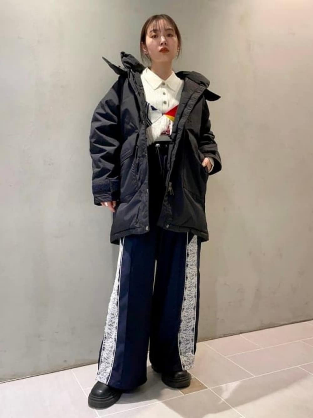 【スポーティMIXスタイル◎】スポーツテイストなアイテムでコーディネートを組みました!〈THE NORTH FACE〉のダウンジャケットはGORE-TEX®︎採用なので雨の日や雪の日に大活躍しますよ〜。ダウンジャケットを羽織る時は中の服装がシンプルになりがちなので〈YuumiARIA〉のアソートビスチェや人気のレースラインパンツで華やかさをプラスしました! Ray BEAMS / カタヤマ アヤ
