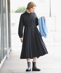 【1枚で決まる綺麗めワンピ♡】前が少し短めになっているので152cmのわたしでもぴったりでした!シンプルなスタイリングのポイントにはダルメシアン柄のスヌードを。 ビームス 銀座 / haru