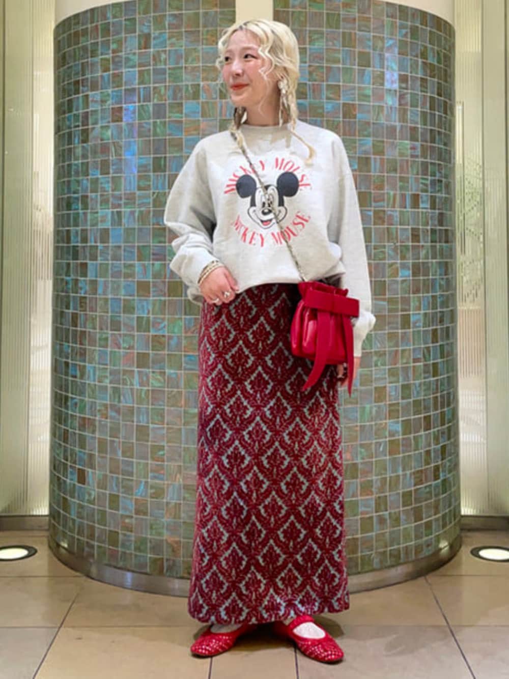 <身長155㎝>Lサイズ着用【別注GOOD ROCK SPEED】「MICKEY MOUSE」 CREWNECK SWEATを主役にスタイリングを組みました♡カップルでお揃いにするのもおすすめです♡© Disney ビームス 天王寺 / ミク