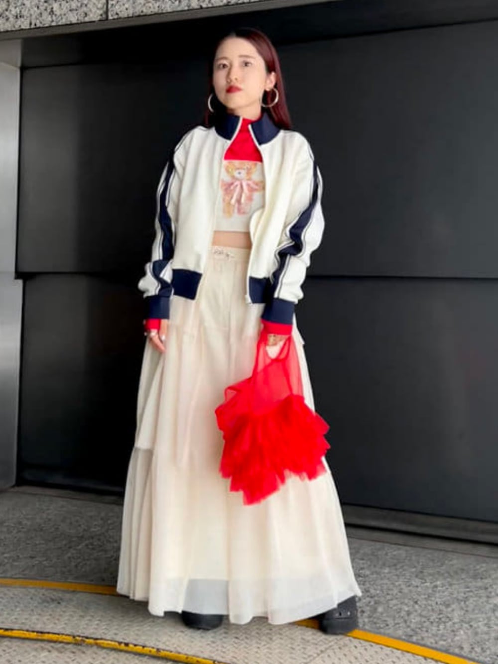 【トリコカラーコーデ】青、赤、白の組み合わせでトリコカラーコーデになりました♥︎ジャージ、メッシュ、チュールとさまざまな素材のアイテム選びでしたが、色味が整ってる分そのくらい差をつけてもいいのかもしれません♡156cmでジャージはサイズ1でゆったりと、スカートはフリーサイズになります! Ray BEAMS / 久保 里沙