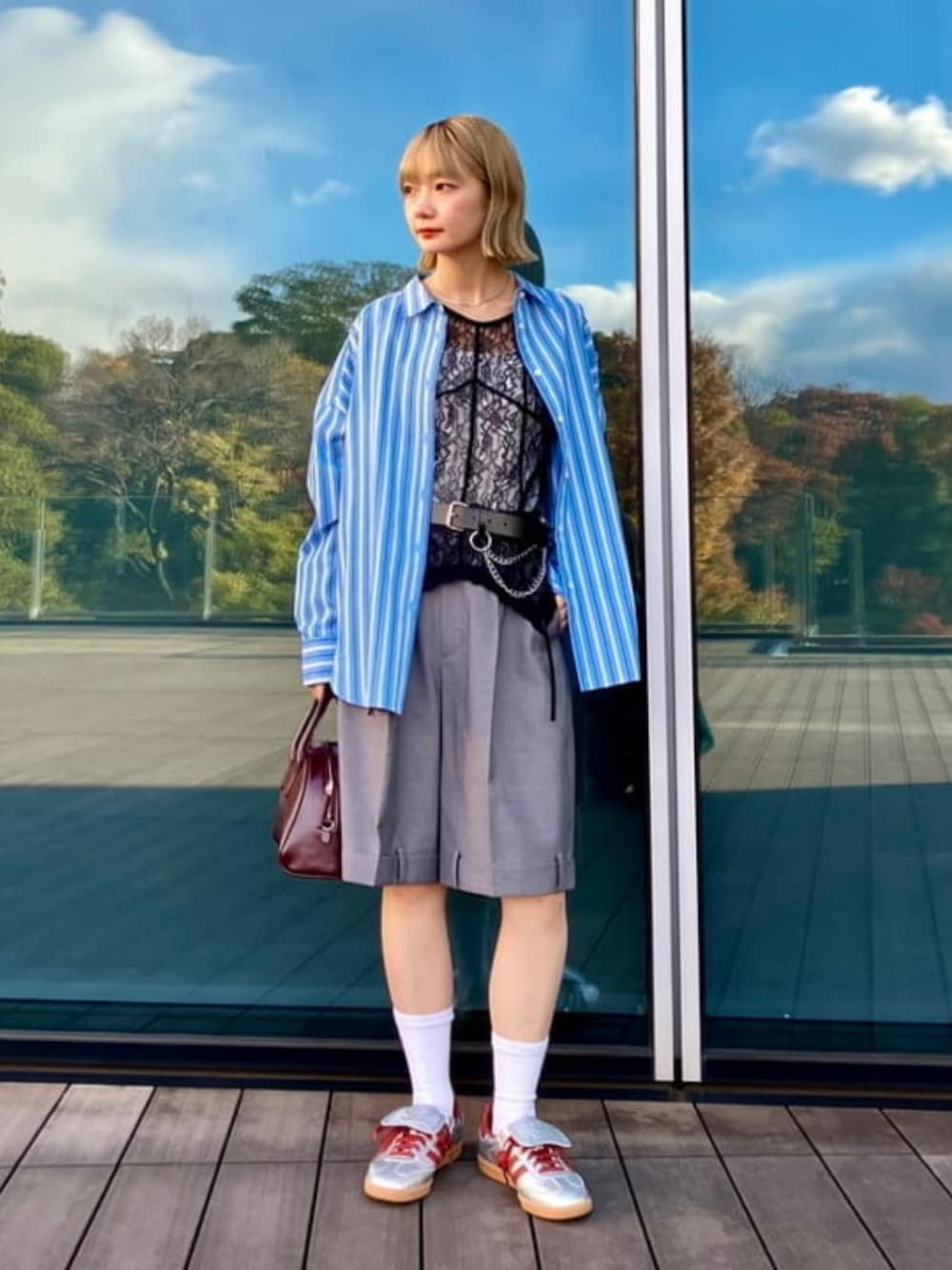 【オーバーシャツにはハーフパンツで】 マルチボーダーシャツは、お尻まで隠れるのでスタイル気にせず着用いただけます♪生地感は薄めなので、着膨れせずすっきりです◎ハーフパンツ上下逆さにしたようなデザインで斬新で可愛いです♡レースを合わせてさりげなく女性らしさを演出してみました! Ray BEAMS / むりょ