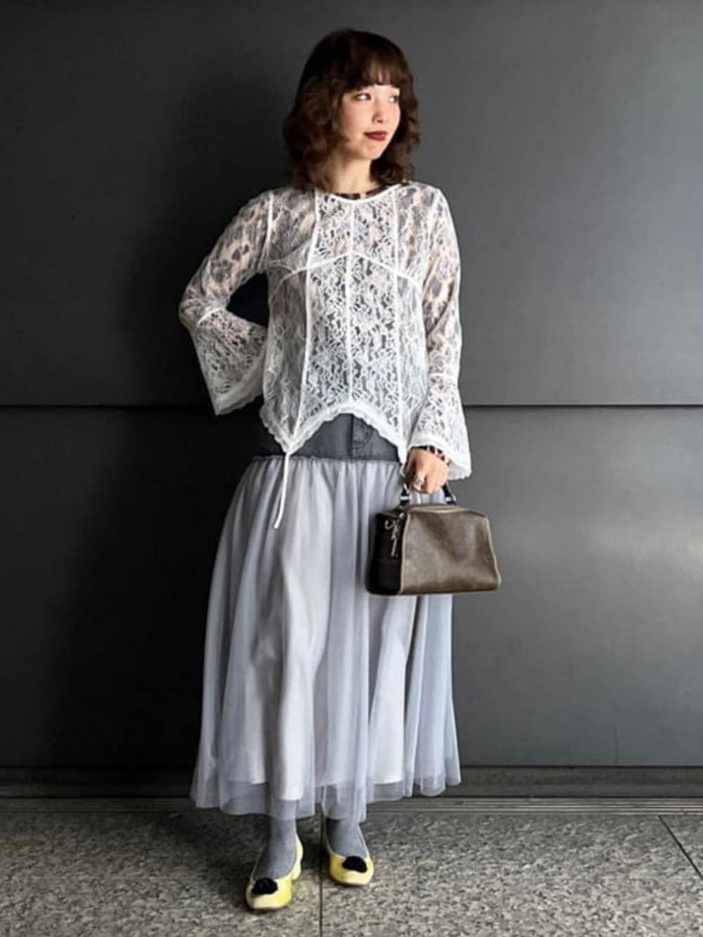 【レース×レオパード♡】の組み合わせを楽しみましょ〜♪強めな印象になりがちなレオパードもレースやチュールと合わせることで今っぽく( ◠‿◠ )デニムとチュールの切り替えになっているスカートでカジュアルすぎずガーリーすぎないちょ〜うど良いバランスに◎ Ray BEAMS / Marin