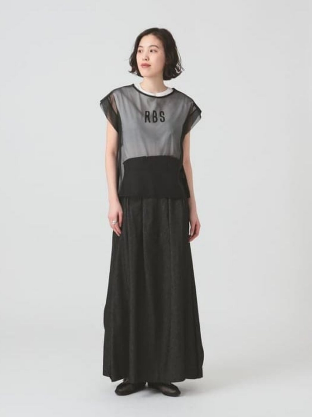 <RBS>のロゴがシアートップスに透けて、ロゴTだけどカジュアルすぎずにレディライクな1着。厚みのあるスカートを合わせてバランス感を意識しました。 レイ ビームス 新宿 / 神坂 莉子