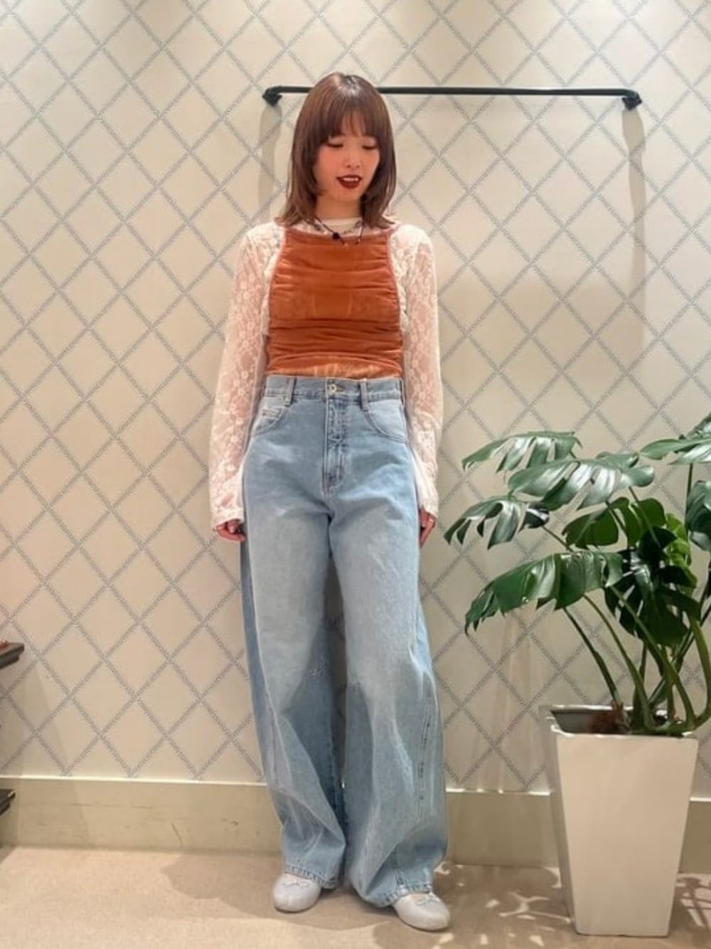水着っぽく<Chika Kisara>のキャミソールデザインのボディースーツとデニムを合わせてみましたっ♡インナーにレーストップスを合わせて今時期でも( ◠‿◠ )夏になったら1枚で肌見せして夏を楽しみたいです♪デニムはサイズ1で、程よくボリュームがあり、ゆるっとしたシルエット◎ ビームス 銀座 / Marin