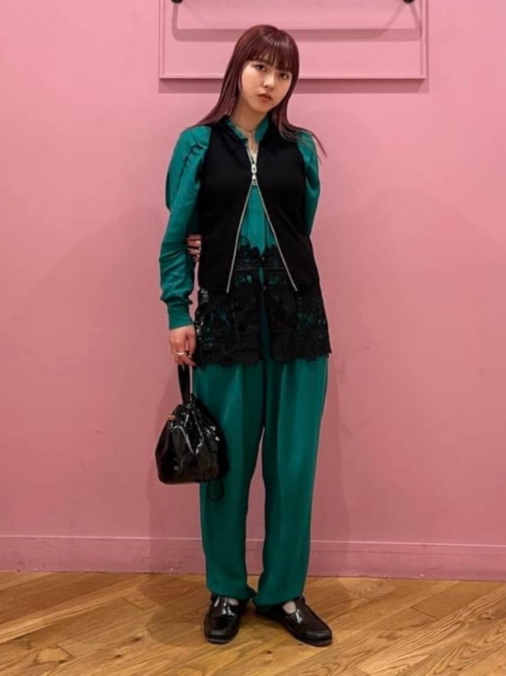 【155㎝/キャミソールをアレンジ】ブラックのアイテムを集めて統一感を出してみました。そして実は腰に巻いているのはキャミソールなんです。本来の着方ではありませんが、こんな楽しみ方もありかと! ビームス 大宮 / シオン