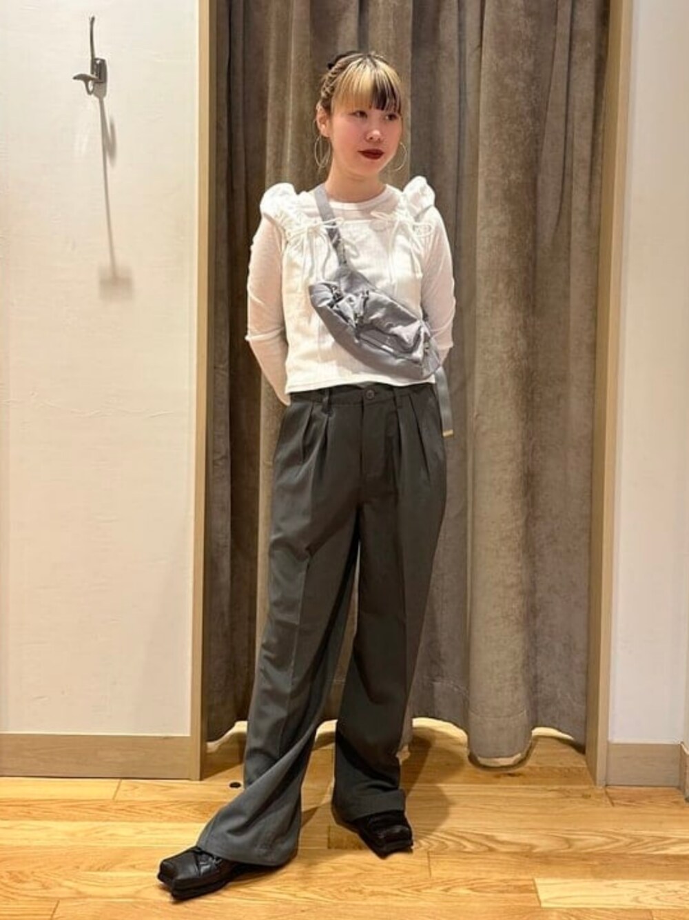 【161cmパンツSサイズ着用】グレーホワイトブラック爽やかカラーです。メンズのパンツのSサイズをダボっと合わせてみました。タックが綺麗に入っているので野暮ったく見えないのが魅力です。ウエストに絞れる紐がついているのでサイズ調節も細かくできます!着用しているショルダーバッグは紐の長さを変えればハンドバッグみたいな持ち方もできます!極力短くして合わせるのが気分です。 ビームス 二子玉川 / まあや