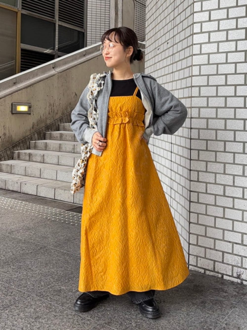 イエローのジャカードワンピースをカジュアルダウンしてスタイリングしてみました!オケージョンまで幅広く使えるキャミワンピです!152cmでSサイズ着用、肩紐で長さを調節可能です。今回はカットソーと、〈BEAMS BOY〉のフーディーと合わせました=(^.^)=