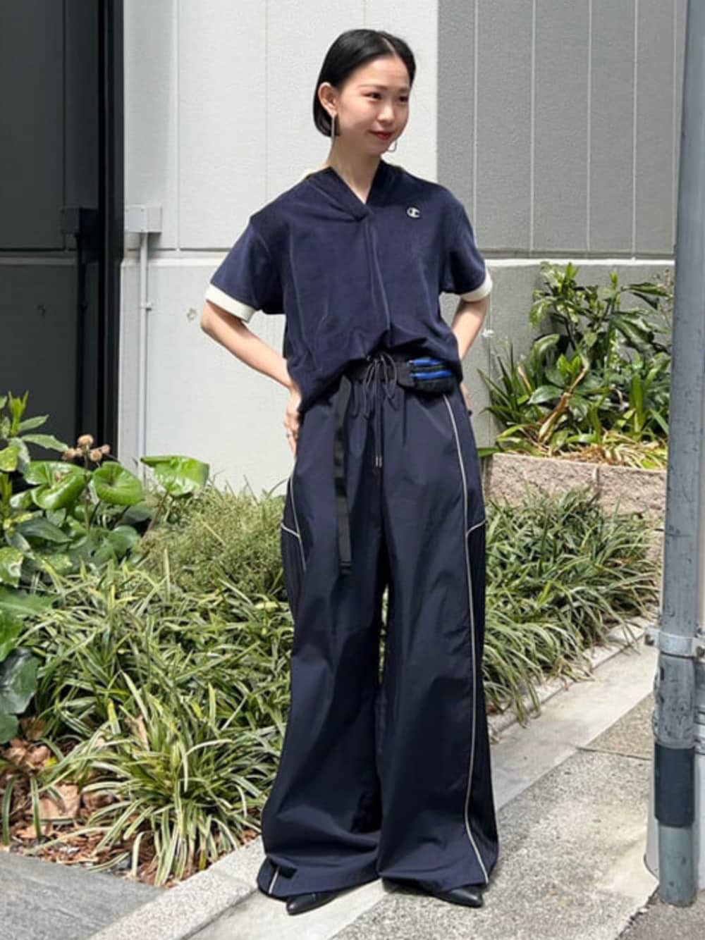 【ネイビーコーデ】個人的に好きなカラーの一つです。スポーティなスタイリングですが足元はミュールで格好よく!!パンツは長めで履きたくてあえてサイズ1で着用しました。ウエストポーチをプラスして一癖つけました。 Ray BEAMS ビームス ストリート 梅田 / 三原 真理