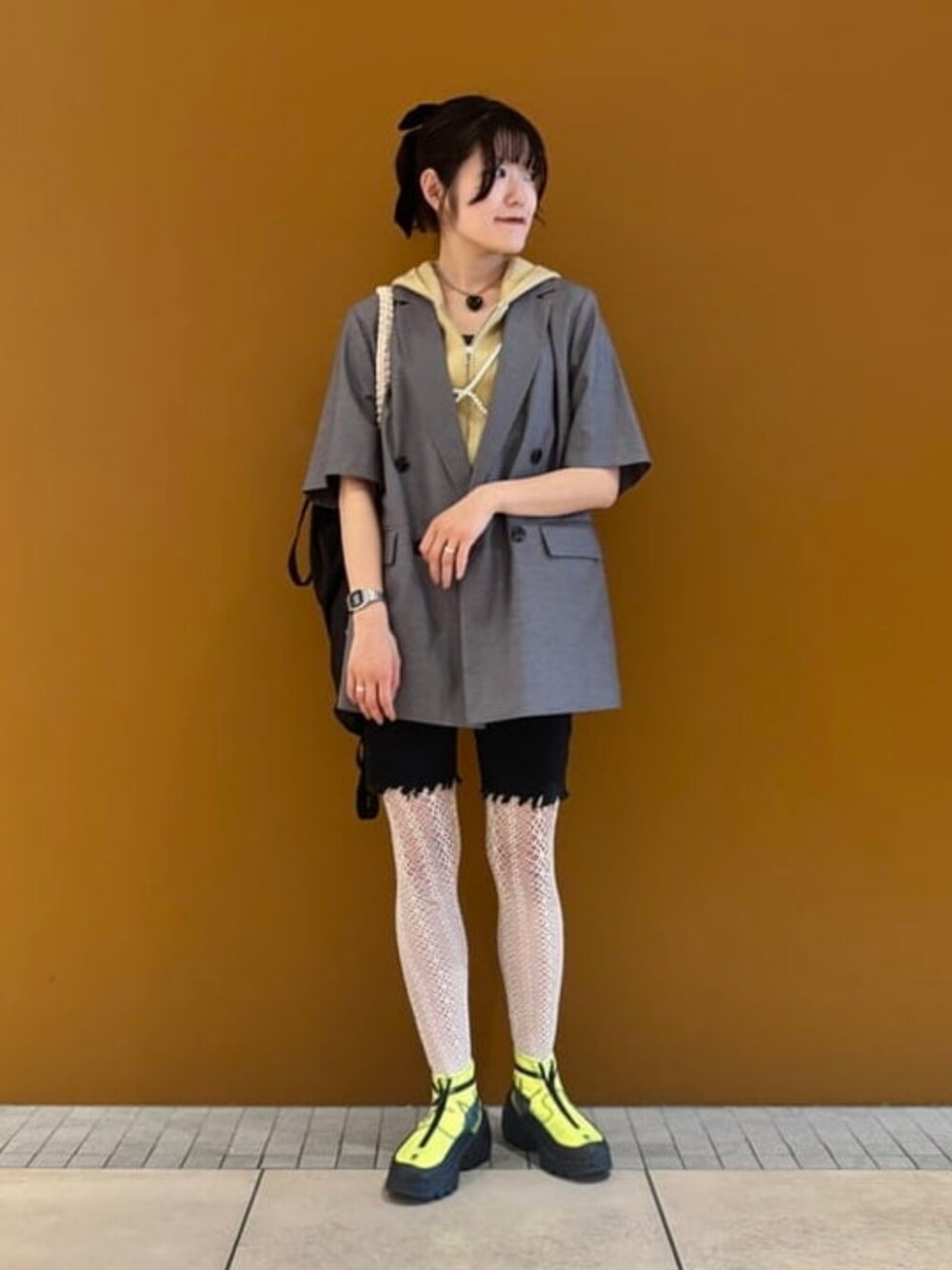 【ジャケット大好き部】ジャケットは1枚あるとスタイリングをグッとまとめてくれるので頼りがちです!笑どうしてもロングスリーブのものが多いので、春夏はどしよかな〜などと思っていたらハーフスリーブのジャケットが入荷致しました!やったー!バイカーショーツって骨盤のラインがしっかり出てしまうのでショート丈のアイテムとはバランスが難しい...ですがオーバーサイズのジャケットと合わせると腰回りをカバーしてトレンド感もプラスしてくれます◎グレー×イエローのカラーリングがお気に入りのスタイリングです!スニーカーだけ浮いてるように感じたので、リュック、トート、ショルダーの3wayで使えるバッグを合わせてスポーティさをプラスしてみました。 Ray BEAMS / タクマ サクラ