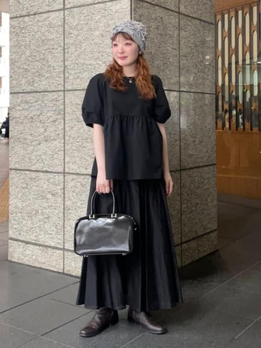 【おすすめトップス】今日はダークトーンで少しモードな雰囲気にしてみました!トップスはおすすめの《ランタンSVギャザーブラウス》。袖がふわっとしていて、ウエストも切り替えがあって1枚でしっかりかわいいトップスです!スカートはトップスの生地とギャップが生まれないように季節感のある綺麗目な素材をえらびました( ◠‿◠ ) ビームス 梅田 / YUKA