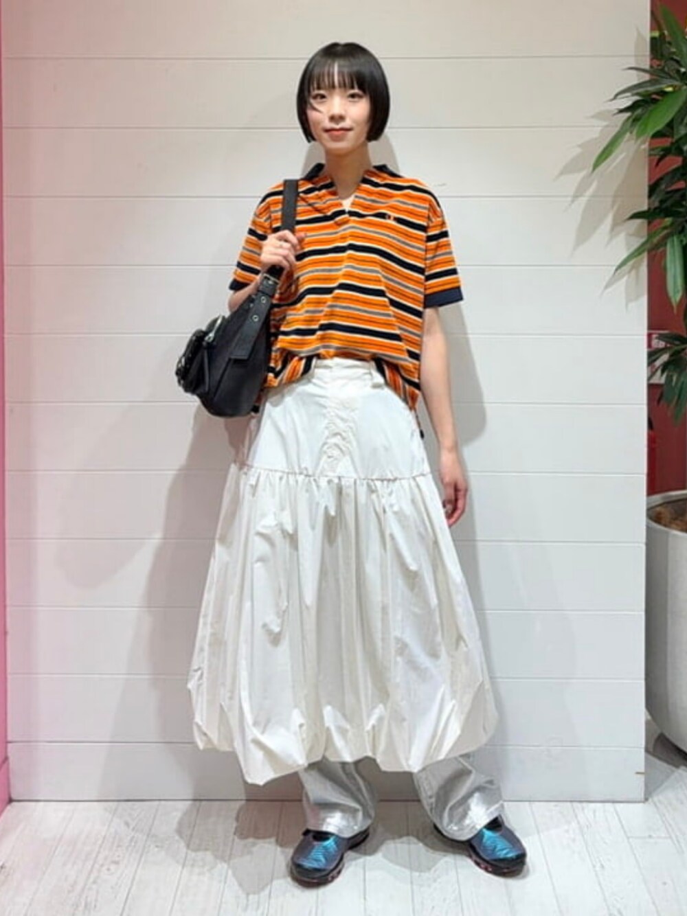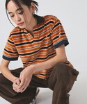 【別注 Champion / ポロシャツ DARK.NAVY×ORANGE】ベロア素材で着心地抜群、夏のカジュアルコーデにぴったりです!ほどよくゆとりのあるサイズ感。トレンドのバルーンスカートと箔プリントのパンツをレイヤードしました☺︎ ビームス なんば / テラザワ アオイ