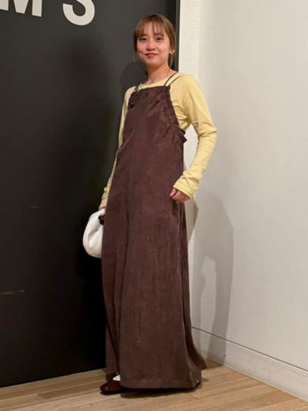 【身長153cm/ワンピース:サイズ1、トップス:サイズフリー】ワンピースの華奢なストラップが可愛いので、インナーはシンプルなカットソーを合わせてみました。表情のあるフィブリル素材なので、シンプルなスタイルも映えます♡滑らかな素材感なので綺麗めからカジュアルまで幅広く着回しできます◎私は春らしくブラウンやイエロー、小物はホワイトで明るくまとめました♡ミ ビームス 町田 / Ito_ririka