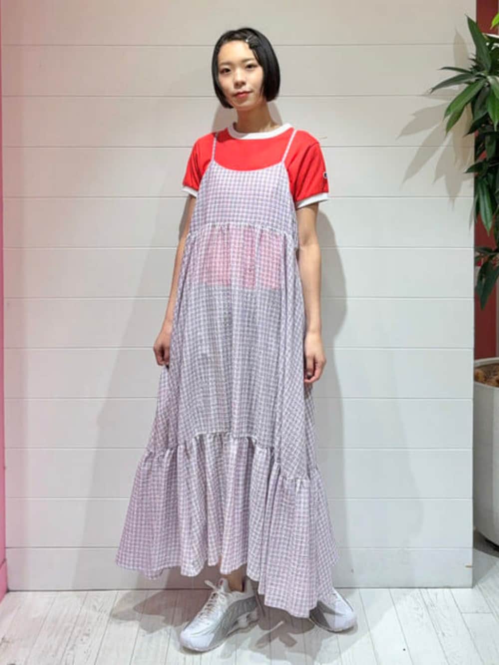 【別注 Champion / リンガーTシャツ】コンパクトなサイズ感でシンプルな一枚。どんなボトムにも合わせやすいです◎今回はキャミワンピースとレイヤードしてみました。透け感がありますが、ペチコートが付いています!中にデニムなど履いてもかわいいですね♡ ビームス なんば / テラザワ アオイ