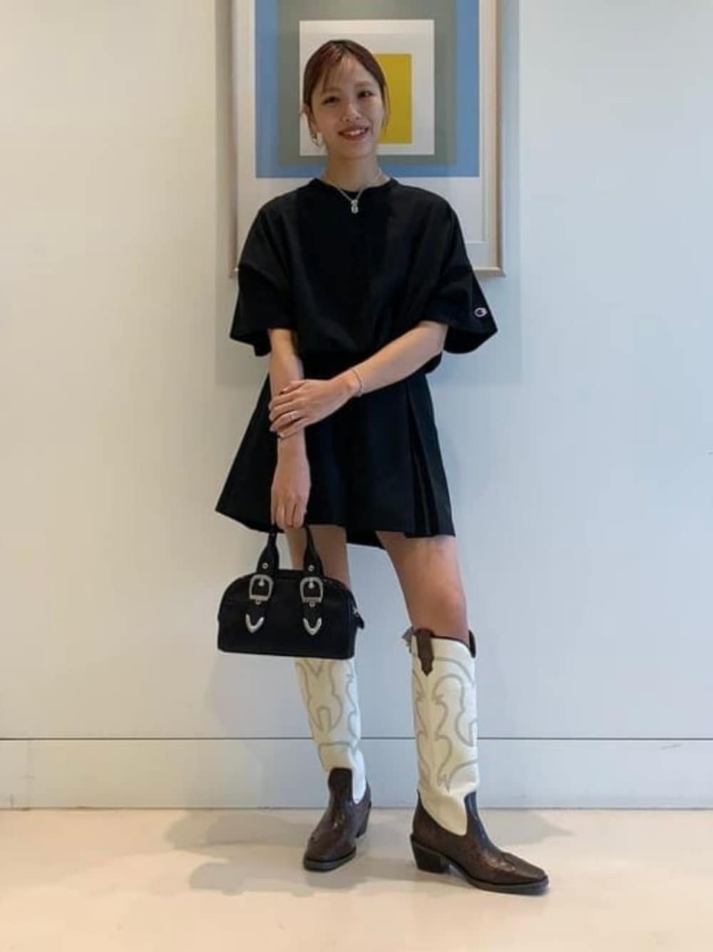 〈Champion〉のTシャツは厚みのあるしっかりした生地。身幅、腕周りはかなりゆったりしています。〈FRED PERRY〉のショーツはパッと見はスカートに見えますが、パンツなのでミニ丈でも安心!足が綺麗に見えるシルエットです◎ Ray BEAMS / れいな