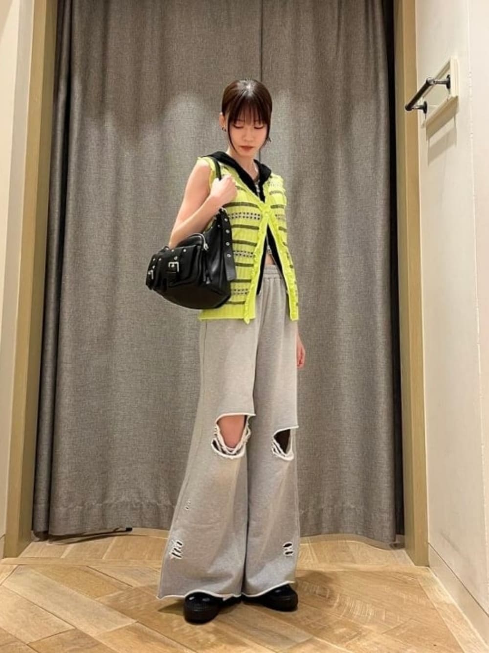〈身長162cm〉 鮮やかなグリーンカラーのフリルベストを主役に、コーデを組みました!トップスが鮮やかだとテンションが上がります^ ^ボーダー部分が透けているので、中に着る服次第で印象を変えることも可能。タンクトップ型のフーディーは、最近流行りのダブルジップになっています。ダメージスウェットパンツは、カジュアルな服装にも、キレイめコーデの外しにも使える万能パンツです。 ビームス 奈良 / mio