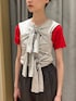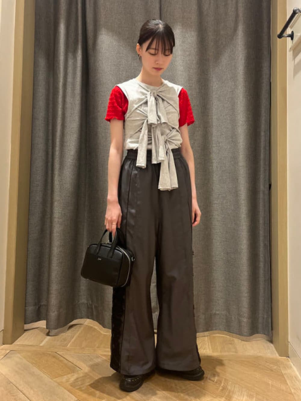 〈身長162cm〉 3つのリボンに一目惚れしたノースリーブトップスを使ったコーデ♡他にも白と黒があります!このトップス、自分で結び目を変えることができるため、キツめに結んだり横にずらしたり、、色々楽しめちゃう優れもの。インナーに色を入れることでより遊び心が加わります^^ ビームス 奈良 / mio