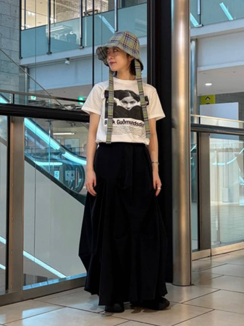 シンプルなモノトーンにチェックの帽子が映えます。153センチでも可愛く履けるスカート。引きずることなく履けるのが嬉しい〜!ボリュームあるのでトップスはスッキリめのTシャツにしました。 ビームス 名古屋 / 濱口