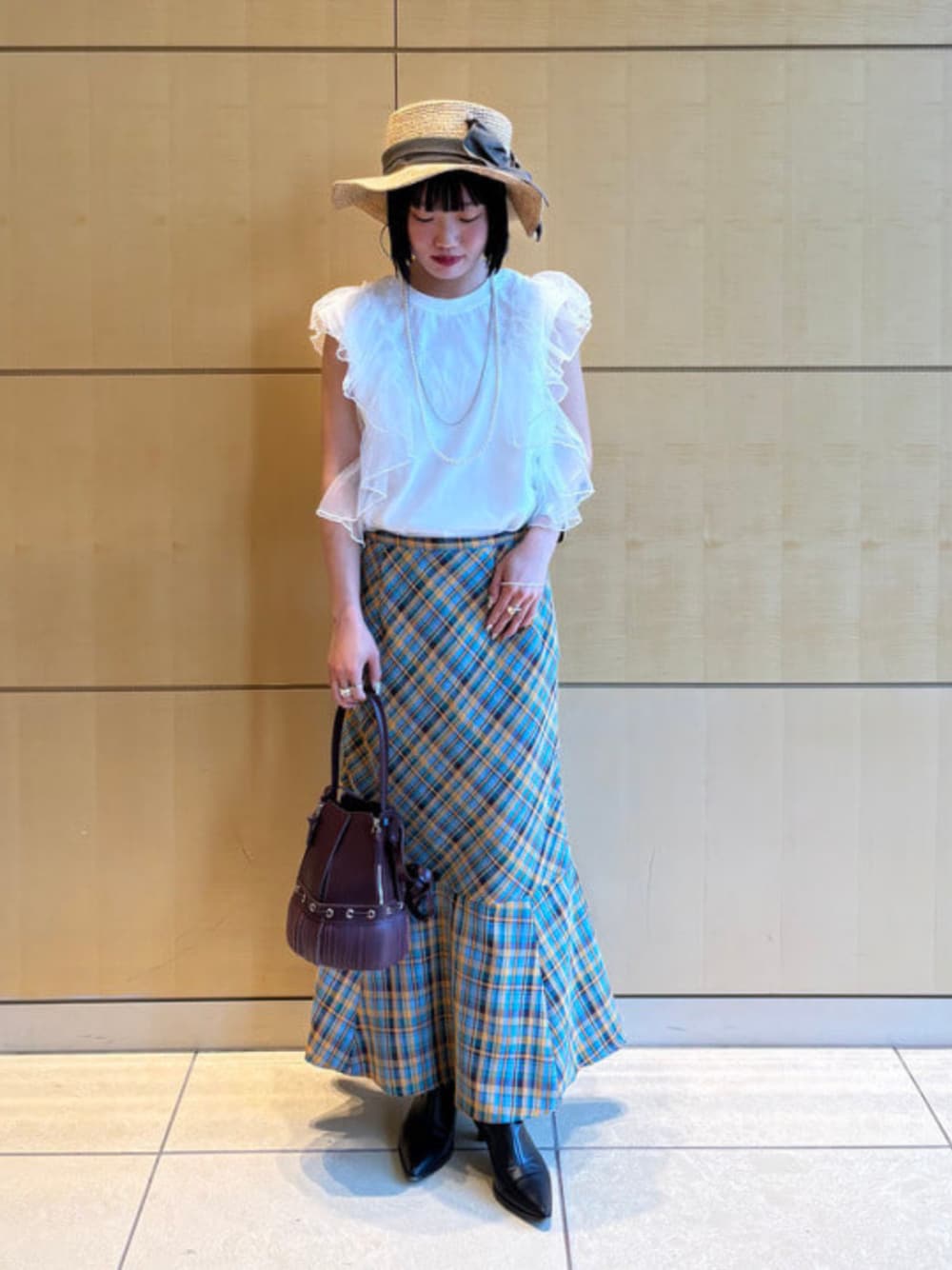 〈海コーデ♡〉チュールがレイヤードされていて、フェミニンからカジュアルにも色々な系統で着用しやすいトップスに、大きめのチェック柄が目を引くデザインのマーメイドスカートで女の子らしいコーディネートで組んでみました!ハットで一気に夏らしいコーディネートに完成しました♡ ビームス 新丸の内 / きらりん☆