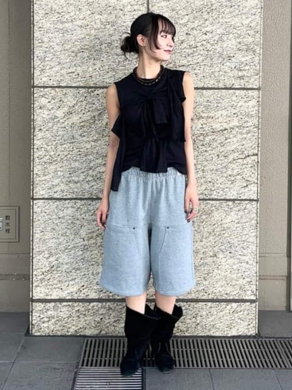 【164cm/トップス FREE/パンツ S】夏らしくなってきたので夏のラフスタイルを組んでみました!⭐︎アレンジ効かせ放題のこのフロントリボンノースリーブがウエストをギュッと絞ったりすることで女性らしいラインを出せるので、BEAMSの別注〈NULL TOKYO〉スウェットショーツを合わせてカジュアル感プラスすることで、ラフでありながらメリハリのあるスタイリングに!◎ ビームス 梅田 / ミツキ