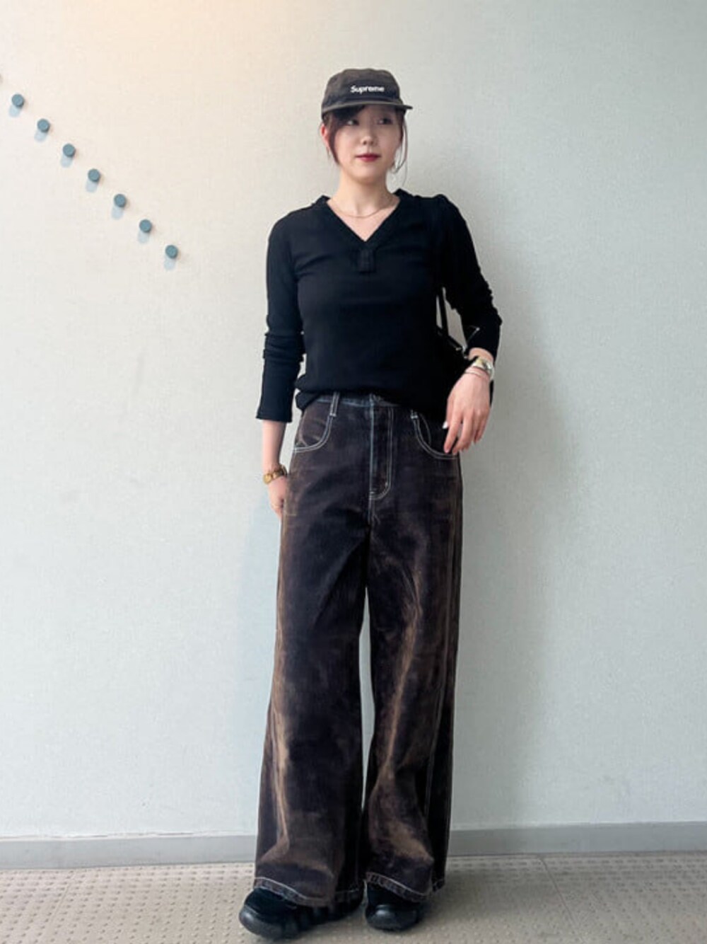 メインはベロアとデニムがミックスしたデニムです!変光的でブラウンがメインで光に当たる部分はブルーに見えます!トップスは首元がVラインで息苦しさもなく、着やすいおすすめのアイテムです! ビームス 名古屋 / りかこ