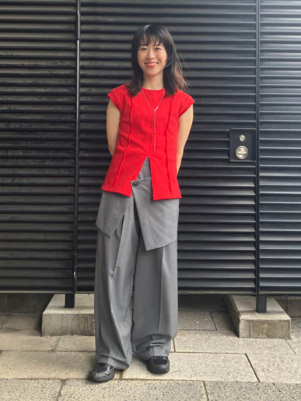 【ママにおすすめコーデ♪】 【身長157cm.骨格ナチュラル】 まだまだ暑いので色から秋を取り入れたトップス、程よく肉厚で丈感もベスト◎ ボトムスは前から見ると巻きスカートを履いているデザイン、後ろはすっきりとしたパンツスタイル。シンプルな合わせでもこなれ感の出る万能アイテムです☺︎ ビームス 東京スカイツリータウン / うに