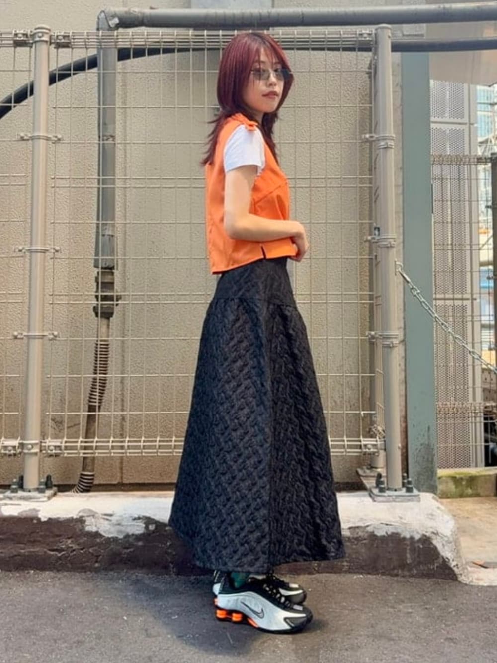 鮮やかなオレンジが目を惹く〈Sister Jane〉のベスト。すっきりシルエットで、ボリュームのあるスカートとも相性◎新作のジャガードスカートも超可愛い。 Ray BEAMS レイ ビームス 新宿 / おミツ