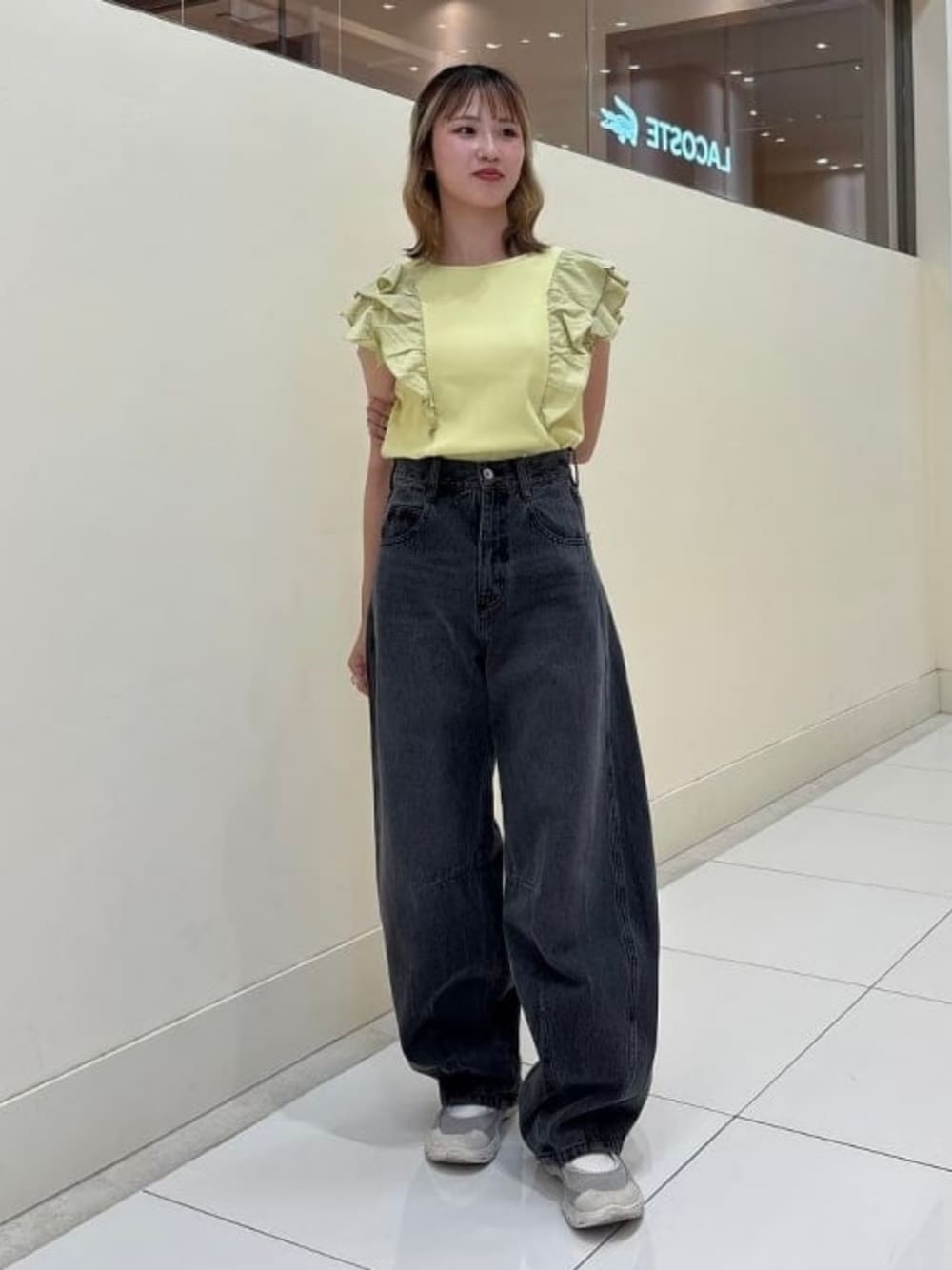 ぴったりしすぎずトレンド感あって可愛いフリルTシャツ!!二の腕が少し隠れるくらいで、細見えできる丈感なのでおすすめです!デニムはシンプルですが、形が一癖ある所がポイントです! ビームス 姫路 / 入江 舞