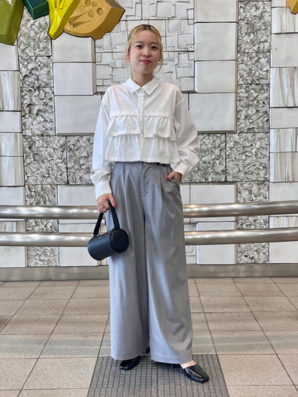 【初秋のきれいめスタイル】〈RBS〉のパンツを使ったスタイリングです^^綺麗なワイドシルエットでスタイルアップして見えるパンツです!私は身長160cmでサイズ0を着用しています◎トップスは、クロップド丈のシャツを選びました!やわらかくとろみのある素材で上品な雰囲気にまとまりますよ!^^ Ray BEAMS ビームス 千葉 / みまた かお