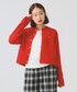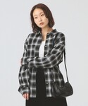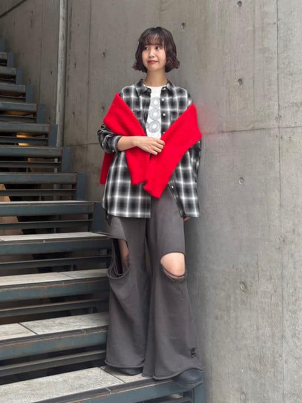 モノトーンコーデには赤色で差し色を。<GYMFREX(ジムフレックス)>のカーディガンはトレンド感のあるシャギー素材。ふわっとした素材感です。チェック柄とスウェットで大人ぽい着こなしにしてみました! ビームス 二子玉川 / mayu
