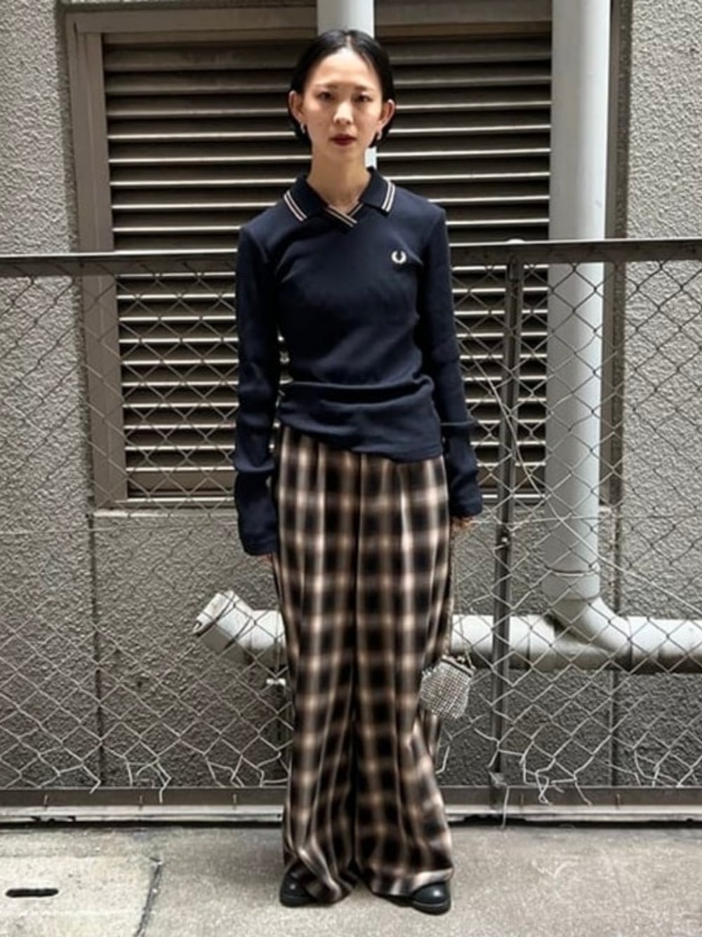 【FRED PERRY】少し肌寒くなってきた今時期にぴったりなポロTシャツ。薄手でフィット感があり細身です。首元のデザインが可愛い。。襟元のカラーと合わせブラウンのチェック柄と合わせてみました。パンツはサイズ1着用でかなりダルっと履いてます♪ ビームス 神戸 / 三原 真理