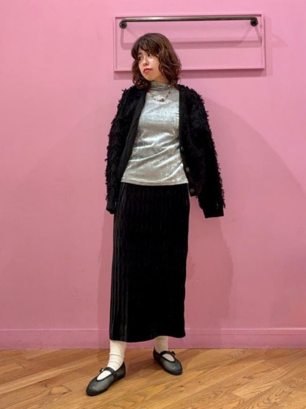 【160cm/スカートサイズ1着用】高級感のあるベロアのタイトスカートにフリンジの効いたカーディガンを合わせて少し大人っぽく。カーディガンはボタンを閉めずに着るとボテっとしなくて◎ワンピースの羽織などにも相性良さそうです^ ^ ビームス 大宮 / リズ