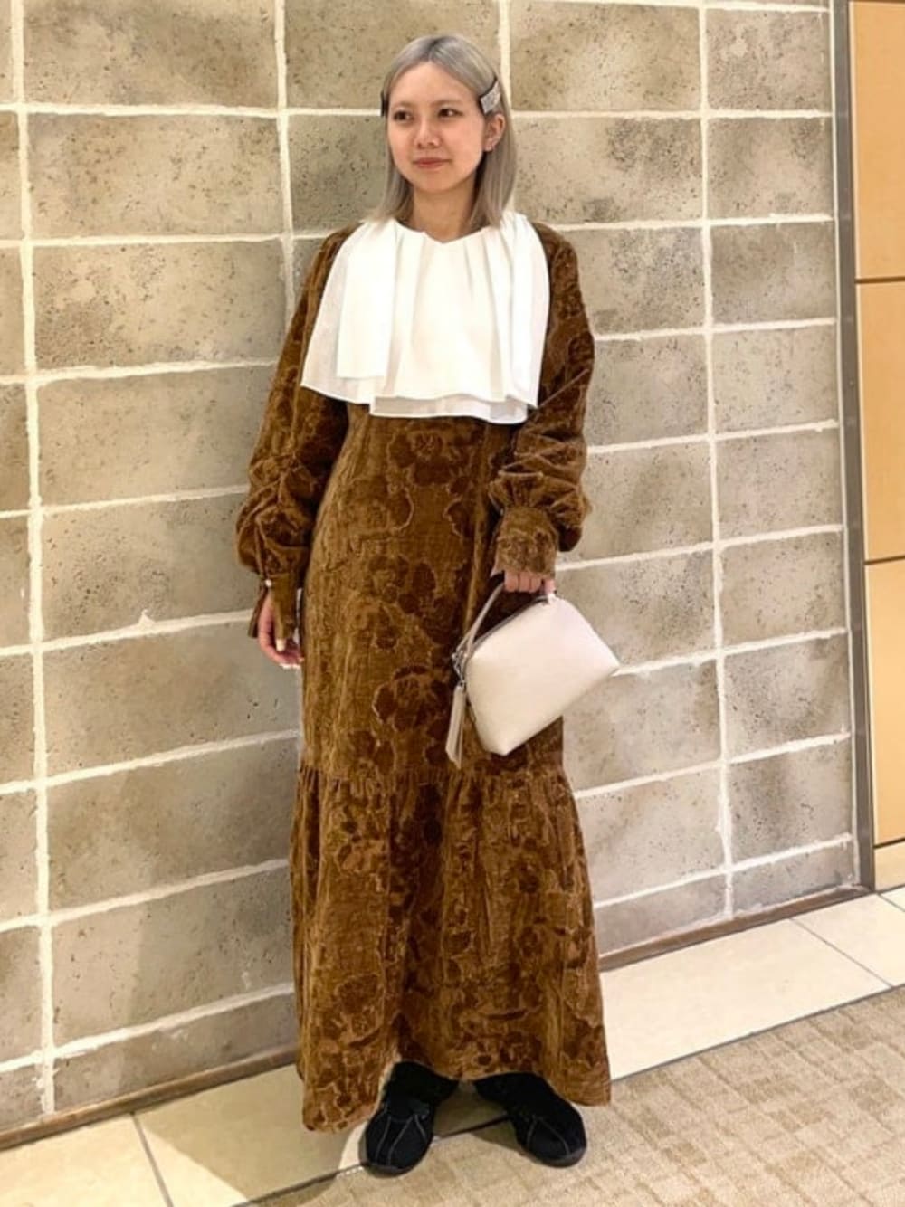 【お呼ばれコーデ】ジャカード生地でゴージャスな印象に仕上がるワンピースです!切り替えによって女性らしいシルエットにしてくれます♡大きなラッフル襟が特徴のブラウスはレイヤードのインナーにはぴったりのディティール♡後ろの襟はないのですっきりとアウターを羽織ってもごわつきなく着ていただけます♫ Ray BEAMS ビームス 新丸の内 / Hiyo