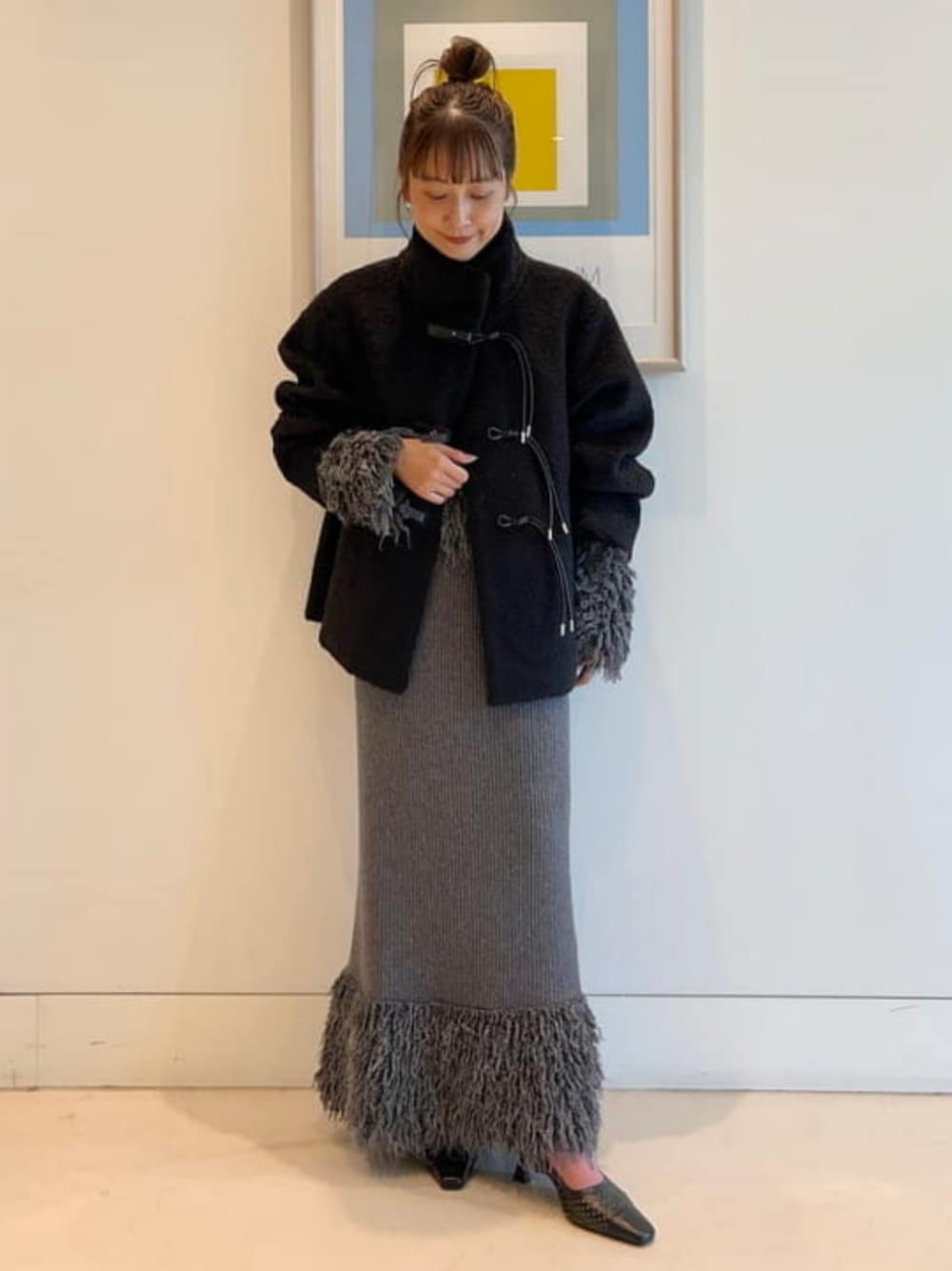 【身長160cm・アウター:1SIZE、ニット:ONE SIZE、スカート:ONE SIZE着用】フリンジのデザインがポイントの《RBS》2nd deliveryのアイテムです♡セットアップになっていて、トップスの方は身幅ゆったりですがコンパクトな丈感でボトムスとのバランスもとりやすく◎ワイドシルエットのパンツと合わせたりするのも可愛いです!スカートはバックに深めにスリットがはいっているので、丈はしっかりありますが足捌き悪くなることもなく着心地抜群です。身体のラインを拾いすぎないのでそこも嬉しい♡それから着用のアウターは、表面のシャギー感が特徴のアウターで非常に軽くて着やすいです。あとは大きめのトグルがポイントですが、冬場に手袋をしていても着脱しやすいので小さなポイントですが、かなり嬉しいとこ! レイ ビームス 新宿 / 大木