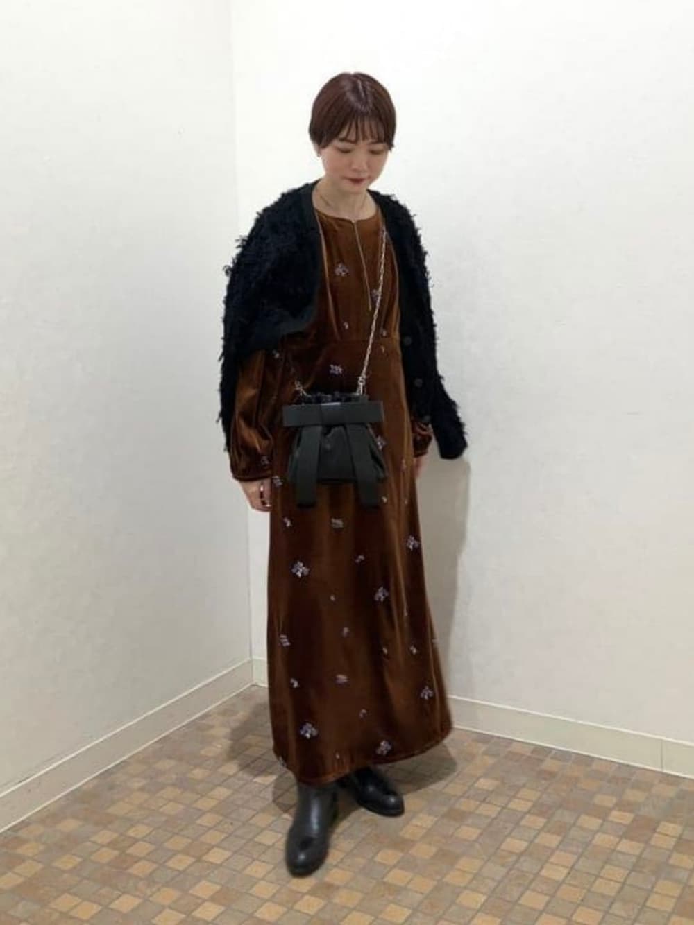 【手洗いできる!推しアイテム】光沢が上品なベロア生地のワンピースを着用しました。花柄の刺繍があって繊細なイメージですが、こちらは手洗い可能です!というのも、よくあるベロア素材には綿・ポリエステル・ナイロン混のものなど実は様々な種類がありますが、こちらは1番軽くてシワになりにくいポリエステルを使っているベロア素材なんです!これから冬にかけて静電気などでホコリの付着などが気になるときは、柔らかい布ではたくといいですよ〜!秋のお出かけにオススメなので是非。 ビームス 池袋 / 森本 理絵