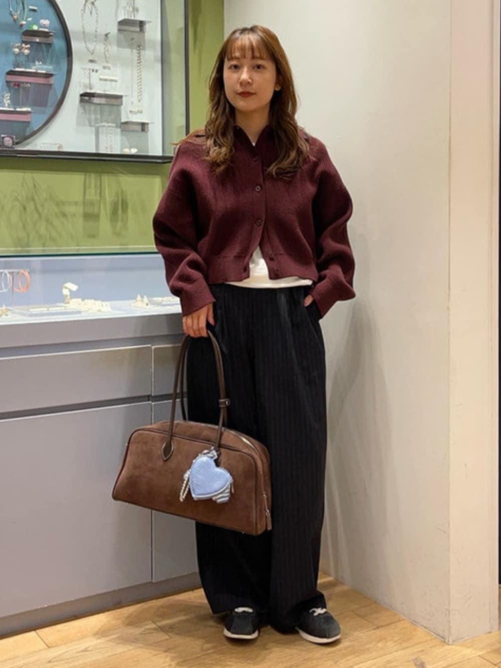 【身長160cm・ニット:ONE SIZE着用】Ray BEAMS別注の《FRED PERRY》カーディガンが今年も大人気です♡なんとも個人的に最近のマイブーム、あずき色のカーディガンが推しです!ロゴとラインのネイビーをパンツで拾いました。身幅ゆったり腕周りもゆったりとしたカーディガンなので、レイヤードスタイルも楽しんでいただけます♡ レイ ビームス 新宿 / 大木